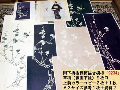 附下着尺用・梅樹糊筒描き「9234」 下絵(線画草稿)9枚と上前カラーコピー2枚+1枚 A3サイズ参考1枚+資料2枚 販売価格15000円(税・送料込み) |