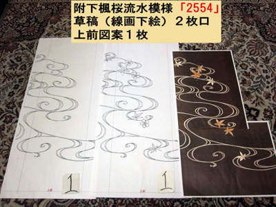 附下着尺用・楓桜流水「2554」 下絵(線画草稿)2枚と上前図案1枚 販売価格8000円(税・送料込み) |