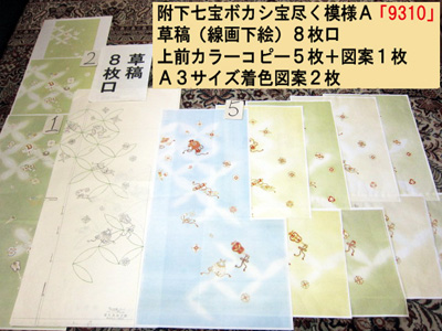 附下着尺用・七宝ボカシ宝尽くしA「9310」 下絵(線画草稿)8枚と上前カラーコピー5枚 図案1枚+A3サイズ着色図案2枚 販売価格15000円(税・送料込み) |