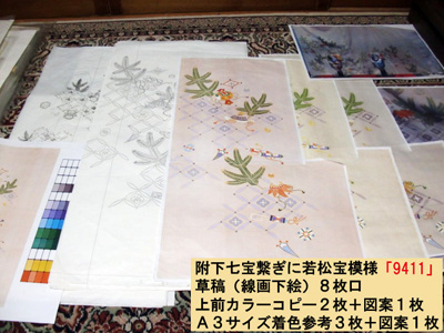 附下着尺用・御所解松竹梅糊付け小袖「2922」 下絵(線画草稿)9枚と上前カラーコピー6枚 販売価格15000円(税・送料込み) |