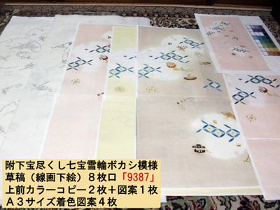 附下着尺用・宝尽くし七宝雪輪ボカシ「9387」 下絵(線画草稿)8枚と上前カラーコピー2枚+図案1枚 A3サイズ着色図案4枚 販売価格15000円(税・送料込み) |