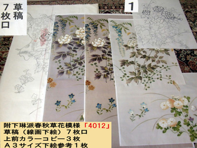 附下着尺用・琳派春秋草花「4012」 下絵(線画草稿)7枚と上前カラーコピー3枚 A3サイズして参考1枚 販売価格15000円円(税・送料込み) |