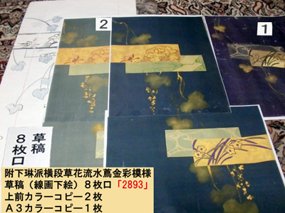 附下着尺用・琳派横段草花流水蔦金彩「2893」 下絵(線画草稿)8枚と上前カラーコピー2枚 A3カラーコピー1枚 販売価格15000円(税・送料込み) |