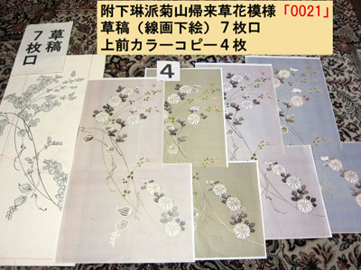附下着尺用・琳派菊山帰来草花「0021」 下絵(線画草稿)7枚と上前カラーコピー4枚 販売価格15000円(税・送料込み) |