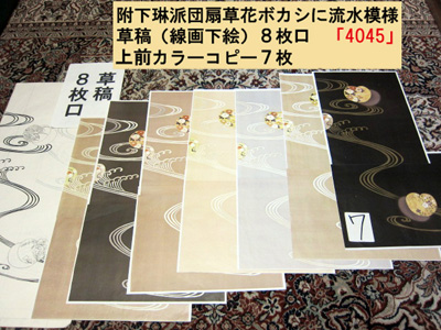 附下着尺用・琳派団扇草花ボカシに流水「4045」 下絵(線画草稿)8枚と上前カラーコピー7枚 販売価格15000円(税・送料込み)」 |