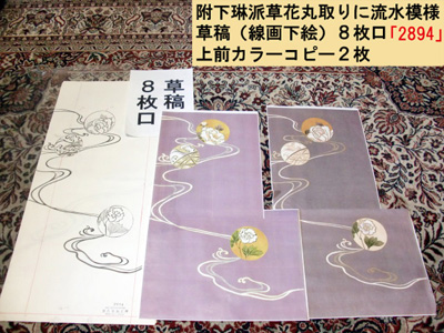 附下着尺用・琳派流水に丸取り草花「2894」 下絵(線画草稿)8枚と上前カラーコピー2枚 販売価格15000円(税・送料込み) |