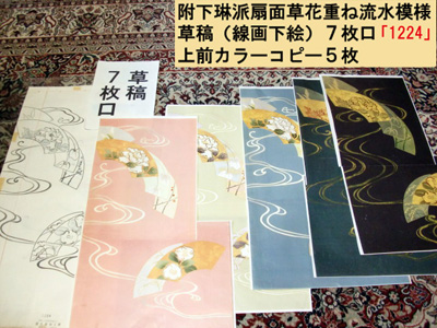 附下着尺用・琳派扇面草花重ね流水「1224」 下絵(線画草稿)7枚と上前カラーコピー5枚 販売価格15000円(税・送料込み) |