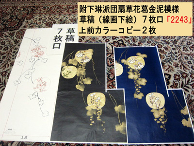 附下着尺用・琳派団扇草花葛金泥「2243」 下絵(線画草稿)7枚と上前カラーコピー2枚 販売価格15000円(税・送料込み) |