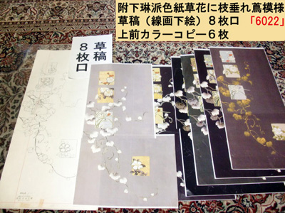 附下着尺用・琳派色紙草花に枝垂れ蔦「6022」 下絵(線画草稿)8枚と上前カラーコピー6枚 販売価格15000円(税・送料込み) |