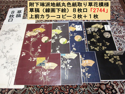 附下着尺用・琳派地紙丸色紙取り草花「2744」 下絵(線画草稿)8枚と上前カラーコピー4枚+1枚 販売価格15000円(税・送料込み) |