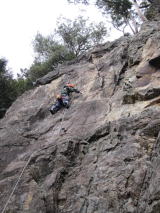 もうすでに12時を回ってしまっていた。まず、腹ごしらえをして、さっそく取り付く、一番簡単そうで、明確なラインである「チムニールート」にKさんが登る、古いハーケンがたくさん打ってあるが効きそうにない、NPの練習もかね、1本くらいいれたが、簡単に登ってしまう。続いて、自分もリードで登る、1本目で初見の緊張があったが、ルートは階段並み、でも「5.4」のグレードがよくわかない、アルパインの3級+か、4級−という感じだった。