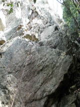 槙尾山の下仏岩西面にできたてのニュールート「でこでこ」「激でこ」に、開拓者の栞さんの許可をもらいトライしました。「でこでこ」5.9は、スタートのムーブが難しい、若干逃げてしまった感じだった。凹凸のあるラインをどう登るかが問われるアルパインクライミングのようなルートだが、面白い。