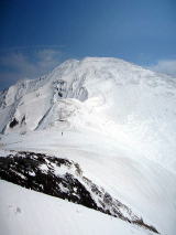 すぐ上にみえるバーンの上の棚まで進むことにした。幅のあるバーンをジクザグに登る、先行パーティーを追いぬき、棚の上にたつ、目の前にはもう一段上の外輪山へのおいしいバーンがあり、中段まででもあがりたかったが、どうも他の2人はここまでもあがってこないようなので、単独行動はできないので、滑走の準備に入った。標高1720m、夏には心字雪渓のあたりだった。1000mを越えるハイクアップは楽ではなかったが、雄大なすそ野をながめながら、大きなターンのきれるバーンは、傾斜は少しゆるいものの山スキーの醍醐味を感じさせてくれた。ブナの林の中の滑降も楽しく、あこがれの鳥海山の山スキーを楽しむ