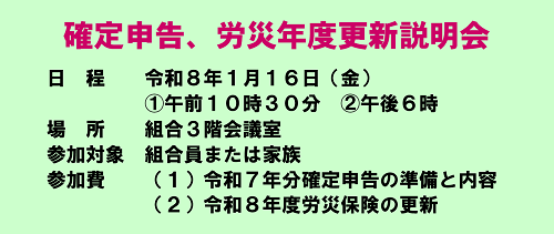 〇確定申告、労災年度更新説明会を開催します 〇税務個別相談会を開催します 別途ご案内の申込書による申し込みが必要です。 〇和建労第75回定期大会を開催しました 〇令和7年度中建国保保険料を掲載しました