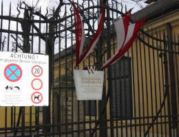 『シェーンブルン宮殿』入口、ヒーツィング門。オーストリアの国家的な重要文化財には、ちゃんとオーストリア国旗が掛かっている。
