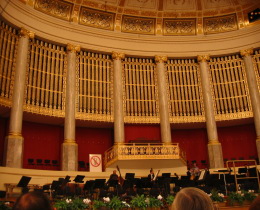 | 本当は、会場内は写真撮影は禁止されているが、公演前にて、ノンフラッシュで失礼した。 『コンツェルトハウス舞台』。すぐ近くの位置にオーケストラが陣取り、その後ろの一段高い場所に、コーラスの場所がある。 このホールは、1800人収容らしい。 |