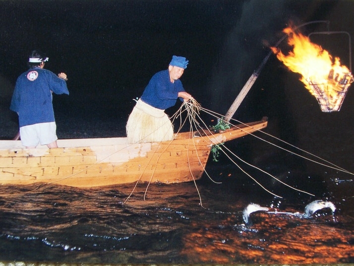 | 鵜飼い観覧紀行 鮎の古い伝統漁法として、テレビ、新聞などで見聞していましたが、実際に観覧して暗闇のなかの幽玄の世界へ引き込まれ ました。 毎日を鵜と共に暮す鵜匠は、杉山一族6人、鵜飼いの里で暮らしていました。鵜匠は鵜の訓練は勿論、健康状態、性質、癖 その日の調子、等を見極め 10〜12羽を選び 見事な手縄さばきで鵜と呼吸を合わせて鮎をとっていました。網で取った のと違い傷みが無く、天然の高級鮎として料亭等に出荷されるそうです。 長良川には専用の御用お狩場(鮎とりのポイント)が在るそうです、観覧当日の鮎は皇室に献上されるものとの事でした |