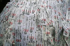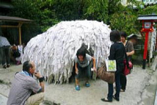 社務所の前に「お札」で張り巡らし穴のあいた祠がある、表から穴を潜ると悪縁を切り裏から表へ