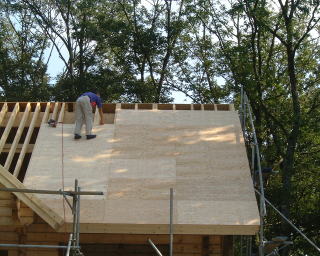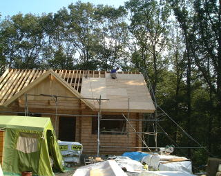 10月8日(火)から野地板を貼り出しました。14日(月)には屋根屋さんが防水シートを貼って下さるので、それまでに野地板を貼り終えて天窓の開口と煙突を作らなければなりませんでした。