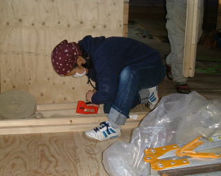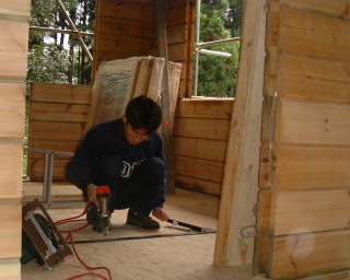 雨なので、中で窓やドアの開口(左の二人)・ログサンダーかけ(右上)・床下地の釘打ち(右下)をして頂きました。