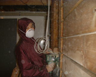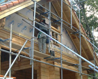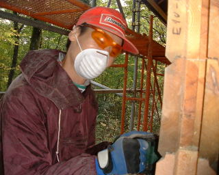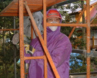 揺れる足場の上での作業です。胴縁を付けてもらっています。『ちょっと恐かった』と正直な人でした。妹夫婦は万全のいでたちでサンダーです。