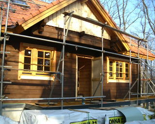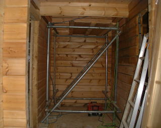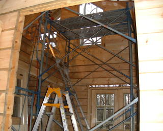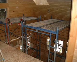 2階は、屋根の形のように三角でややこしい所もあったり、寝っころがって貼ったりと、ちょっと大変でした。でも、寝室の天窓の所もまずまずきれいに出来ました。(ご機嫌)。階段とリビングは足場を組んでの作業です。リビングはビケ足場を借りて来ました。『わーい!お部屋にジャングルジムだ〜』と妻が喜んでおります(苦笑)。