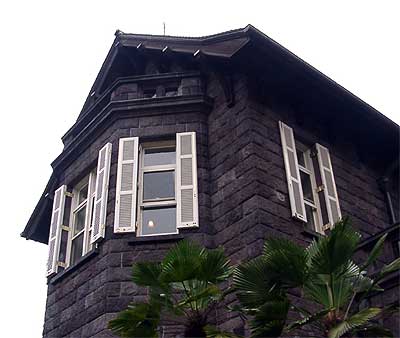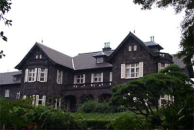 洋館は、天然スレートぶきレンガ造り。 ニコライ堂や鹿鳴館を設計した英国人建築家、ジョサイア・コンドル晩年の作品です。 事前申し込みが必要ですが、屋内をガイド付きで案内してもらうことができます。 ここを訪れるのなら絶対洋館を見るべきです。 こんな変わった和洋折衷の建物はない。 なにしろ一階は大理石造りのマントルピースやサンルームがある普通の洋館なのに、二階へ上がってドアを開けると、なんと畳敷きの和室が・・・。 そして、仏壇まで。 そうかと思うと、和室に出窓があったり。 ふすまとドアが二重になっていたり。 これ、折衷と言うのかな? 混在? コンドルは、こんな洋室と和室の混じった建物を4つ設計したそうですが、現存するのはここだけしかないそうです。 ウッキーが訪れた日は小雨交じりの天候だったから、外壁の安山岩が濡れて一層重厚感をかもし出していました。