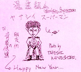 金城 武の字と絵。あんまり上手とは言えませんねぇ。誰が温柔(やさしい)超人(スーパーマン)なのか意味不明です。さらに?なのはその横の落ち葉なのか唇なのかわからない謎の物体X(エックス)の正体です。どういう意味があるのでしょうか? では雄一(兄)の字と比較してみましょう。 ちなみに中国語でスーパーマーケットは「超級市場」と言います。超級市場では万引き防止のためカバンを入口で預けなければならない店も多くあります。