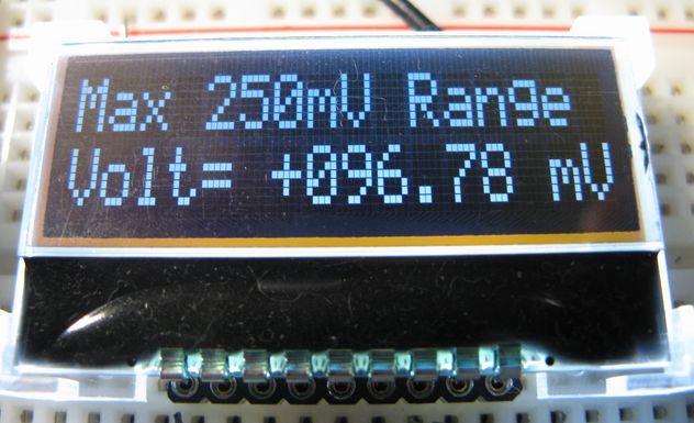- 内蔵の基準電圧が2.048Vで16ビット分解能なら、2048/65536で最小値は31.25μVだと思ったのですが、負電圧にも対応していて、2048/32768で62.5μVだとわかりました。(それでは15ビット分解能?)