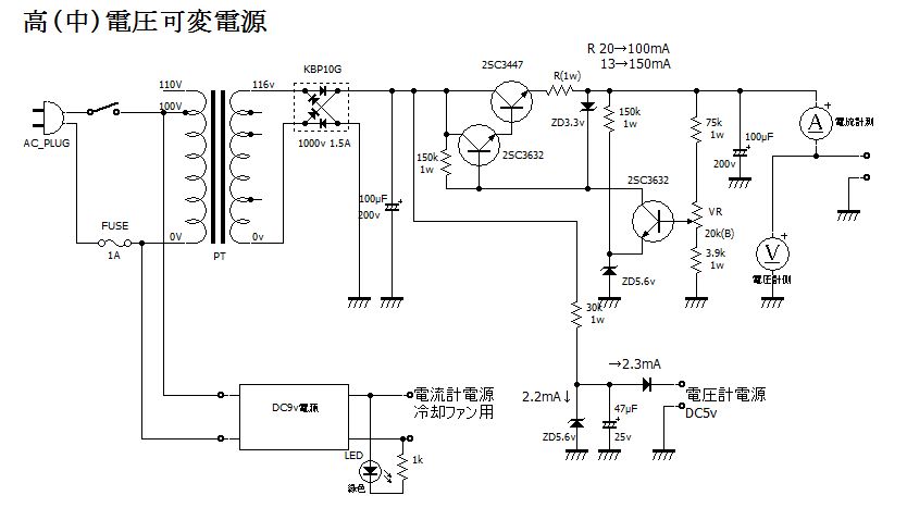 - 電圧の可変と保護回路は、簡易真空管テスターと基本的に同じ回路および部品を使用しました。トランス2次側116vをブリッジ整流して、可変出力25v~140vが得られました。ただ、出力制御用のトランジスタ2SC3447は小型のヒートシンクを付けてもかなり熱くなります。出力端子の短絡等(過電流)に対する保護回路は組み込みましたが、低い電圧時の電流値には要注意です。少しでも冷却の足しになるかと60mm角のファンをつけました。パソコン用のファンです。定格は12v駆動ですが、9vでも充分(静かに)回りますので電流計の電源9vから供給しました。