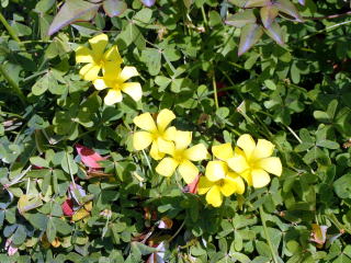 三つ葉のハート形の葉を地面に広げ、春から秋にかけて小さな黄色い五弁花を次々と咲かせる。