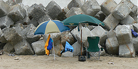 2日目、パラソルを出しましたぁ 何故か変なポーズをとってしまいます… 波待ちは、オヤジの井戸端会議