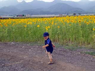 サホロを後にして富良野へ移動する途中にヒマワリ畑を発見。とても綺麗に咲いていたので写真を撮りに立ち寄りました。俊介も車の移動が長かったので、車から出たら走り回っておりました。こういった風景がいかにも北海道らしいって思います。お天気がいまいちでしたがね。