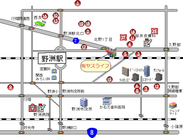 | ⑤ | 野洲駅北口駐車場 | 北野1丁目22 | なし | 8,000 | 8,800 | 坂本油化向かい |