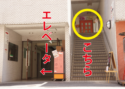 エレベータをご利用の方は、階段左手の通路を少しお進み下さい。階段を上られる方は、上りきった正面が『やわらぎ治療院』になります。