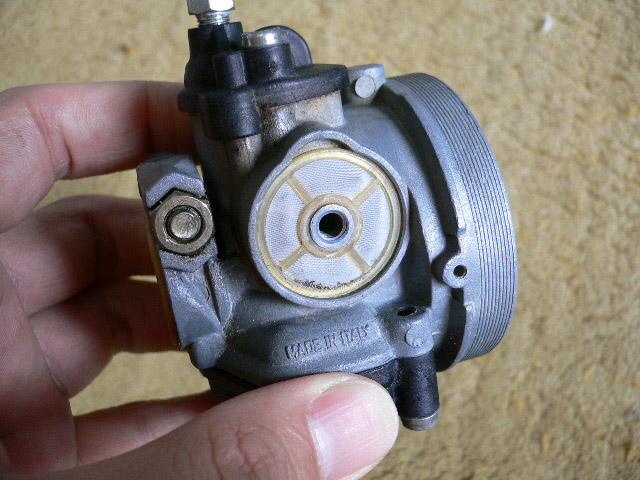 赤丸のビスをゆるめてキャブ本体を車体から取外す。