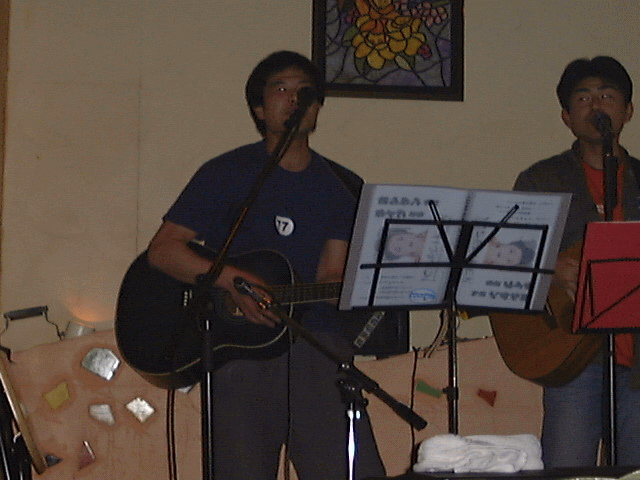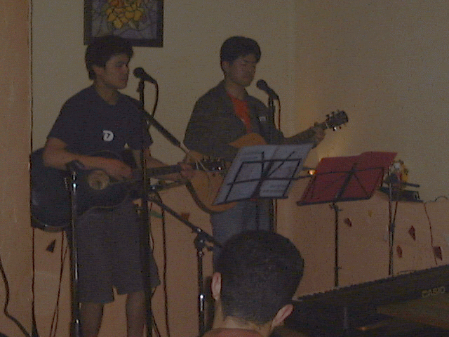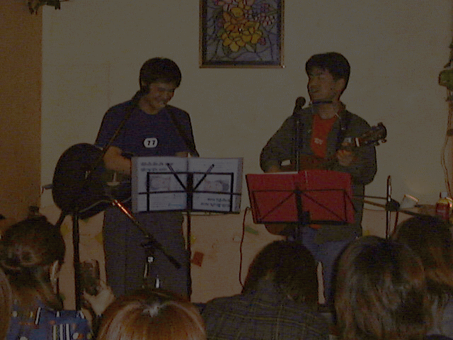 2001年4月14日 今年一番の暖かい日でした。 ヨシケンついにフェルマータにてライブハウスデビュー。 三組合同ライブの「大とり」として最後に出演しました。 「どーも!ヨシケンです!」でスタート。 1曲目『この声』 「この声がこの声がいつかいつか君に届け・・・」 ほぼ満員の中、ステージ慣れしていない二人は やや緊張気味ではありましたが、 一曲目から気持ち良く歌い出しました。 2曲目『自転車に乗ってあの丘へ』 すでに竹田は汗だくもよう。 久西はわりと熱いのには強いのですが、 ライトの熱は想像以上のもの。 このへんも路上との違いだなぁと思いました。 3曲目『この壁』 ライブ終了後、ちょっと反省した曲。 テンポが早すぎました。 恐るべしライブハウスマジック・・・。 次回は気をつけます。 4曲目『星の降る部屋』 5曲目『絆』 二人それぞれが歌ったバラード。 前の3曲が乗りのいい歌だっただけに 少し違ったヨシケンをお見せできたのでは・・・ 6曲目『あの頃のまま…』 「心の中ではいつも少年時代のままでいたいと思う」 高校の文化祭で、二人はステージに立って ギターを弾いていました。 あの時を少し思い出しました・・・。 7曲目『世間話』 路上ライブやホームページなどの世間話をした後、 今度は『世間話』という曲。 この前振りから曲へ行く流れはこれからも使えそう・・。 8曲目『チャンス』 「チャンスは君の足元にいつでも転がっているから その翼広げ新しい世界へ飛び立とう」 いよいよ最後の曲。 路上を始めた頃は、ライブハウスで出来るなんて 思ってもみなかった。 頑張っていればチャンスはあるものだ。 少し勇気を出すだけで新しい世界は広がります。 そんな事を伝えたい曲でした。 僕達の歌を聞きに来て頂いたたくさんの方々 本当にありがとうございました。 僕達の初ライブは無事終了いたしました。 次回も楽しんで頂けるようなライブをしようと思います。 これからもよろしくお願いします。 |