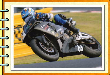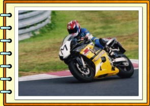 | SUZUKI GSX-R1000 JSB1000仕様 中身はJSBマシン、外装は8耐用(ホントに走った)に 溝付きタイヤを履かせたというバラバラ仕様(^^;) さすがに、ストレートは激速。 ブレーキングもスムーズで安心してかけられる、 さすがブレンボ。 写真はカメラを意識して走っているのではなく、 常にこれくらい戦闘モードで走らないと危ないマシンでした。 案の定、集中力が続かず転倒(涙) |