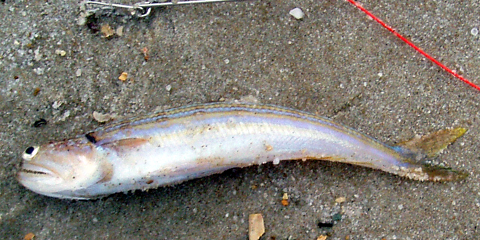 2本針の仕掛けに、このオキエソとギンガメアジが同時にヒット。オキエソはわかるが、何故ギンガメアジが?