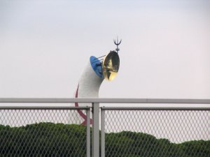 ご存知「太陽の塔」です。なんと言っても、これを見れば万博公園に来た気になります。自宅からそれほど遠くないのですが、もともと千里丘陵と呼ばれていた土地なので、公園に近づくにつれだらだら上り坂が続き、この日は梅雨の合間の曇り空で蒸し蒸ししていたのもあって、周回道に入るころには汗だくでした。その分帰りは下り坂なので快適です。今までの最高速度45km/hを記録しました。
