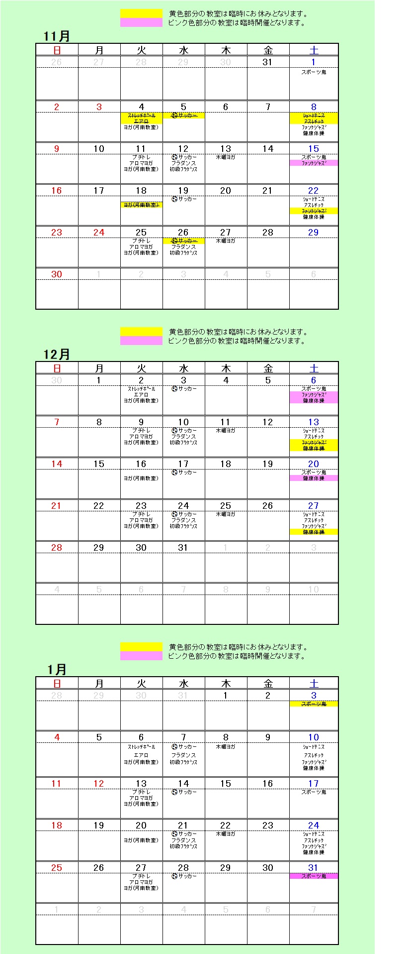 2025年11月~2026年1月のスケジュールは以下となります。スポーツ鬼ごっことアスレチック教室の詳細は別ページに掲載しています