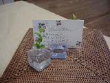白いテーブルクロスを敷くとそれだけで、我が家のダイニングがレストランに早代わり。季節や来られるお客様に合わせたメニュー決め。ランチパーティーは出来るだけ一緒におしゃべりできるようにあまり手の込んだものはしません。前日から煮込むものやオーブンで焼くだけのものなどにします。メニューが決まれば、メニューカードを書きます。そして、料理に合った食器選び。お客さんが来られる前にテーブルセッティング。小さな塩・コショー入れはミントの葉を入れる花器に変身。左の写真のメニューはパエリアミックスを使った「簡単パエリア」、「じゃがいもとねぎの生クリームグラタン」、Party Cupsを使った「フィンガーサラダ」。フィンガーサラダの中身はクリームチーズ&ミニトマトとゴールデンキュウイ&ヨーグルト。スープは思いっきり手を抜いて「市販のコンソメスープ」。レシピスタンドを置いて、作った料理が載っているレシピ本を開いておくと主婦仲間に好評かなと試みでしてみました。
