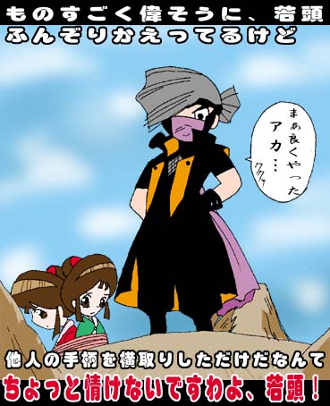 物語りも後半へ!! シンゲツ藩に到着しました、半月かけて!の回。 さて、どうやら陸の孤島(ぽい)シンゲツ藩に、どうやって入ろうか思案中、なヒヲウ達。 目指すシンゲツ藩はもう目と鼻の先。そこで崖つたいに通れる山道を(でも風陣が先にワナを張っていて、その道は通れず)、その砂浜にぽつんとある漁師の子供に教えてもらいますが、 この子供が、今までのなかでダントツに地味(大笑)。 スタッフさんの中で、漁師のイメージはこういうの!ていう意気込みを見せてもらったような気がします(大笑)。 ま、それはともかく。 その漁師の子供はおじいちゃんと二人暮しの様子。 今回、そのおじいちゃんと、通訳役の少年のおかげで、結果、海の方からシンゲツ藩に上陸(?)するのですが、 この子供、今までにない、てか、馬並に受難です。(大笑) これが美形なら、みんなそんなに疑ったか!?(爆笑) 正しい事を言っているのに、何を言っても「ウソだ!」だとか、「ダメじゃん!」だとか、言われっぱなしの少年。 溺れたヒヲウを助けたり、マユをヒヲウと一緒に必死で探したり、あまつさえ、そんなチョカなヒヲウのために船出したりと、なにかと人情的な対応をしているにもかかわらず、なぜこんなにも受難なのか? それって絶対美形じゃないからだと舞は思う!! だって、有坂君なんて、何言ってもみんな鵜呑みに信じてたじゃないか! ぜったい顔やて!判断基準!! くぅ、せけんは世知辛いものよのぅ。(めそめそ) ソレとは別に、今回、また新たな情報が! なんと、アカさんたちは機の民を殲滅する事をあきらめていた!? いつの間に!? しかもアカさん、溺れるマユを助けるという紳士ッぷりも発揮。 なんで!? 今まで、関所を避けて逃げ回るように旅をしてきたヒヲウ達。 確かに、最初は華雪が一緒のせいだったけど、風陣対策もなんぼかはあったんちゃうんかい。 今となっては風陣は機の民に興味はない、なことを、アカさんが言ってますが、これが、海で溺れたマユを 助けて言ったセリフなだけに真実味があるのですが、よもや、以前はヒヲウ達を殺すために追っ掛けていた人と同じだとは思えません。 えぇ、思えませんとも!! どれほど必死になって逃げてきた事か! 今となっては華雪を捕らえるために、巻き添え状態扱いのヒヲウ達。 でも、だからといって「はいそうですか」て華雪を風陣に渡すわけないじゃん。 ということで、派手な砲撃くらいつつ、偶然に訪れた月食の引き潮かげんで、おじいさんと少年の言ってた「海の道」をホムラで渡ることに。 あぁ、偶然てスゴイ。アッパレ!! 今回馬たちは、サイ兄ちゃんに先に誘導してもらってました。 よかった。馬受難回避!(笑) そして、サイ兄ちゃん、乗馬できるんや!!かっこいい!そんなことまで出来るんや、サイ。萌え〜(笑)。 その馬たちの後を、海の道を渡る人型のホムラ。 今回、頑張ったなぁイザーク(違SEED)…じゃなくて、ホムラ。 まるで人間のような関節だったよ。 そんなふうに足腰動かせるだなんて、パイロットのヒヲウ&シシのレベルが上がったのか? いや、それ以前に、そこに関節とかあったのか?ホムラ。 そこは突っ込んじゃいけないところなのですか?ボンズさん(製作社)。 というわけで、突っ込まずに次に(笑)。 風陣の攻撃で、思うように進めないホムラ! 月食のタイムリミットが終わった! 焦る一行!! 「潮が満ちてくる!!」 マチの声に答えるヒヲウ「遠いんだ!次の石が!!」 え!?サイ兄ちゃんと馬はどうなったん!? 馬で泳いだのかな、……うん、きっと泳いだんだよ。(勝手に断定。) ぜんぜん画面に出てきてないけどっ!! まぁ、なんとかかんとか、ハデに海を渡ったヒヲウ達。 でもヒヲウ達の身を案じて、華雪が自ら海に投身。 よくぞ、あんな岩がごろごろしてる海に飛び込めたな。 そんな雪にちょっと萌えかも(大笑)。 で、トリは、なんと若頭!!