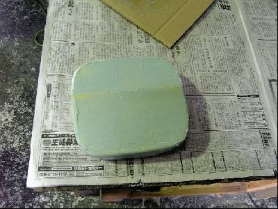 | クリアゲルコートを塗ります。 硬化したらカーボンクロス、ガラスマットそれぞれ1プライ積層。 角が浮いてしまいますが、だいじょうぶ。 | |