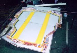 補強板をフランジの大きなリベットで 止めて完成。 いま流行のスケルトンだ〜。 ジュラルミンの3分の1ぐらいに 軽量化できました。 この後、車両に取り付けて 思いっきりぶつけてもらい、 どおなるのか実験します。 |