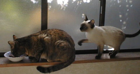 | チーちゃん、何食べてるの?アタシも欲しいでし。。。 あれ?窓の向こうに見える茶色い物体は・・・ジャイアン??(^。^;) |