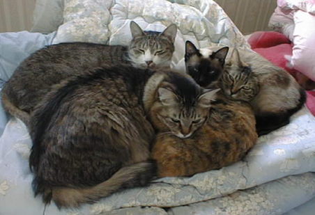シーツを洗濯中に積み上げた布団の上で団子になってました