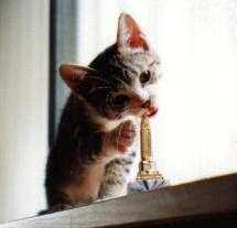 ニューヨーク土産のエンパイアステートビルの置物をかじるニャン。