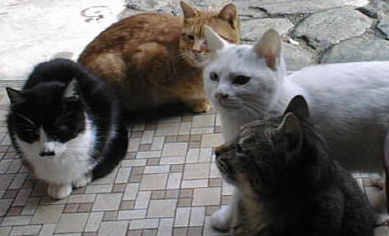 | 左から「シロクロ(チョビひげ)ちゃん♂」 「故茶トラくん♂」「故白ちゃん♀」「きじとら、ミーナちゃん♀」 |