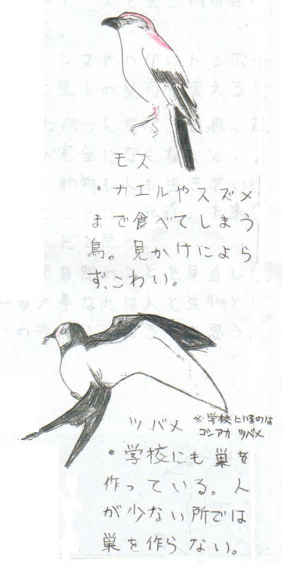 始めにしょうかいした通り、里山に住んでいる人達は私達とちょっとちがった生活をしています。田や畑を耕したり、道にはえた雑草を刈り取ったり、米を作ったり、しかし、そこにも生き物がいます。田んぼにいるクモなどを食べるモズ、山から流れる川にいは魚やカゲロウという虫がいて、コサギ、アオサギ、セキレイといった鳥がたくさんいます。もし、人が田んぼを耕したりしていなかったら、きっとそれらの生き物は見ることが出来なかったと思います。人と生き物は、こんな所で共存していたのです。